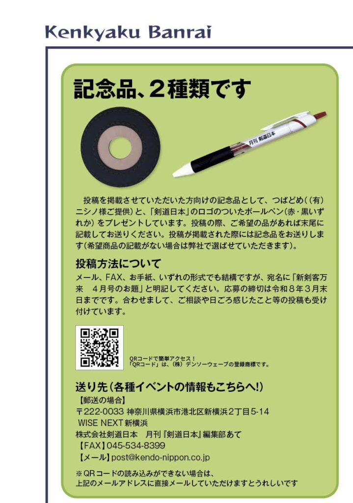 投稿用メールアドレス post@kendo-nippon.co.jp(タイトルに、「剣客万来のお題」と記載願います)
