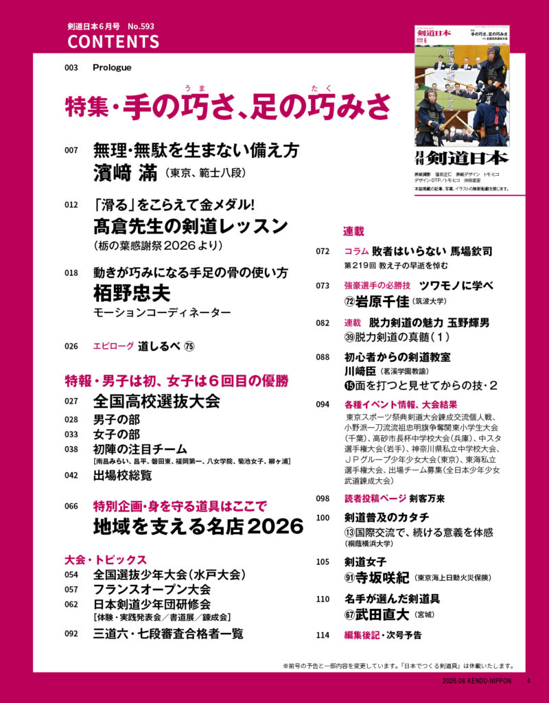 剣道日本2026年6月号は、4月24日に全国の書店で発売されるほか、公式通販サイト、Amazon、楽天市場で取り扱っております。(通販サイト、楽天でのご購入者の方へは22日にポスト投函予定です)
