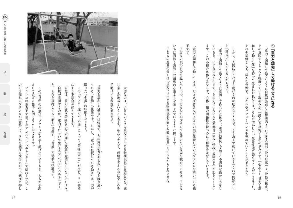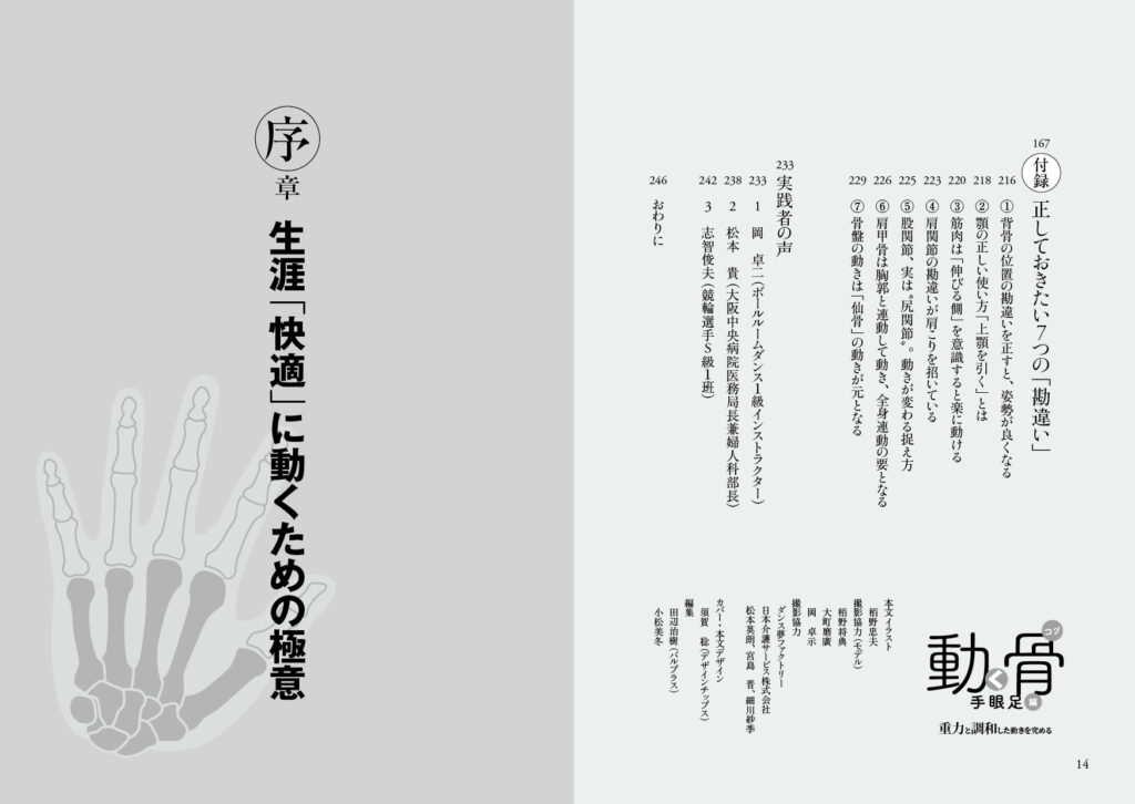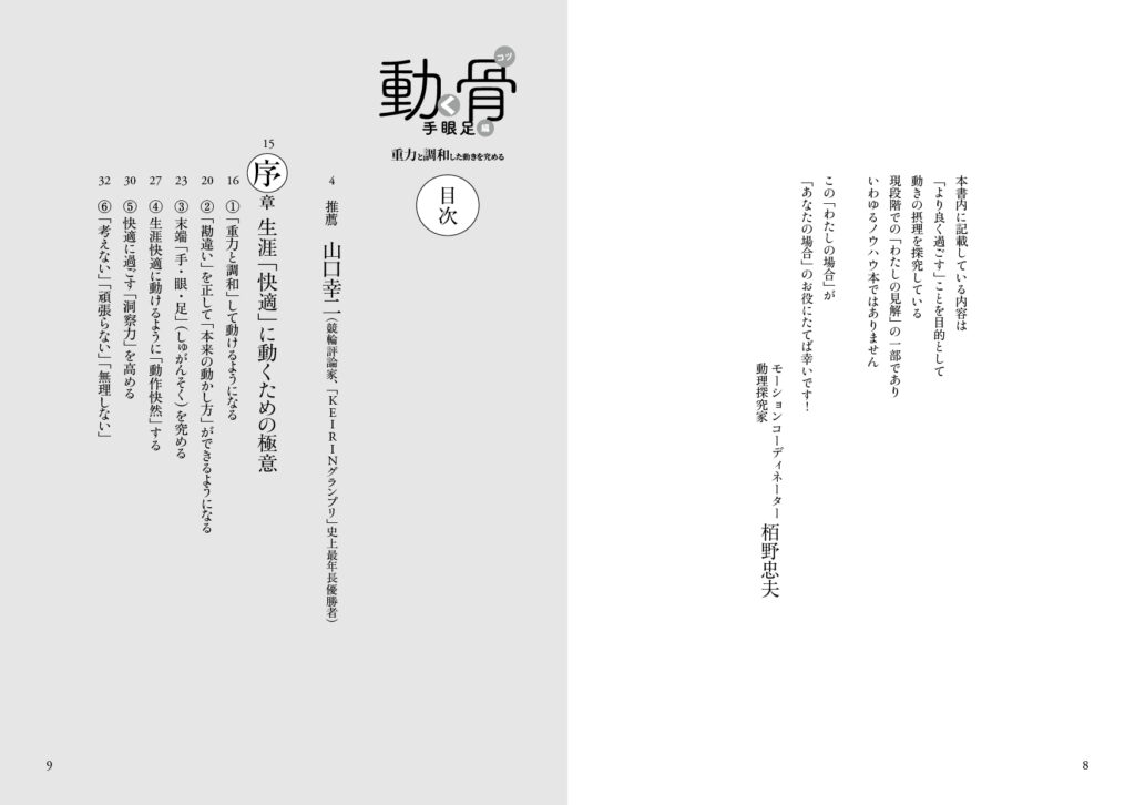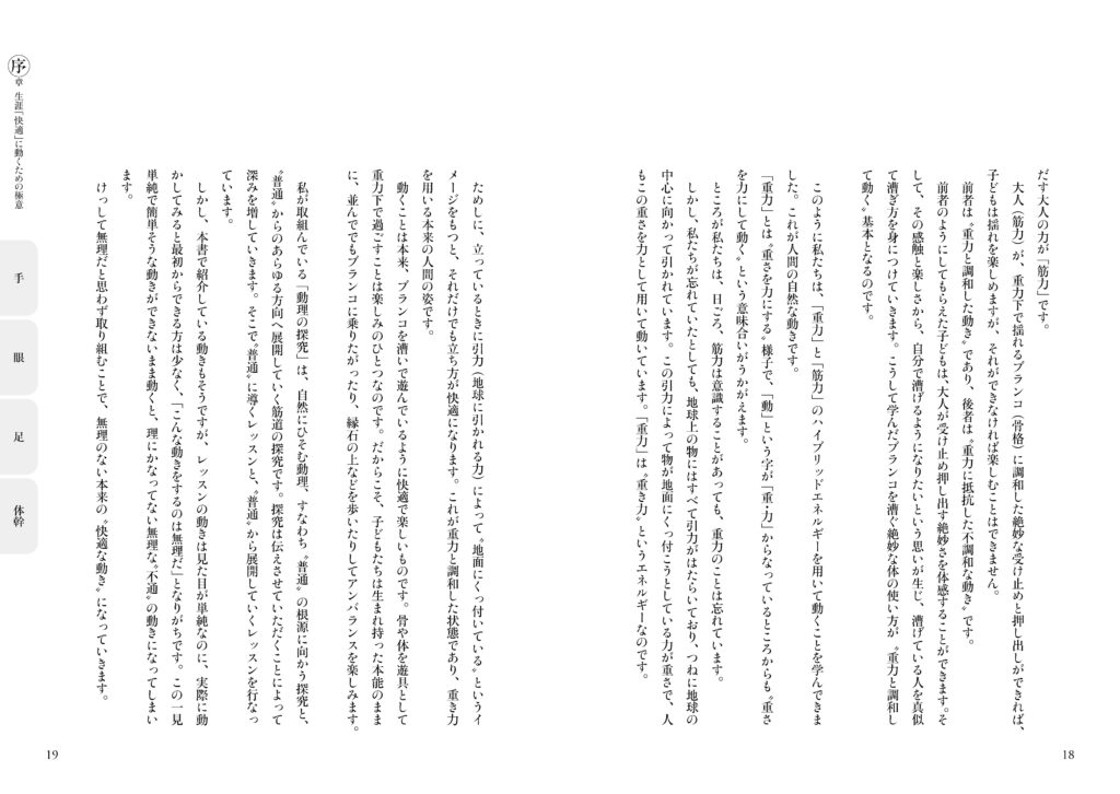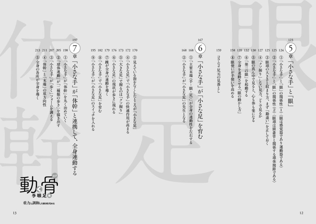 著者はトヨタ自動車(株)にエンジニアとして勤めるも、持病の腰痛を自力で克服したのを機に「人体の奥深さ」に好奇心が向き、それを探究すべく1999年に同社を退社した。以後、自らが持病を克服した手法による「体調快善」の支援を始め、自然と調和した身体の動かし方の探究「道理探究」に取り組み、骨格構造に主眼を置いた独自の身体操法「体幹内操法」を2002年に創始。その基本要素を、2005年に上梓した『動く骨(コツ)』にまとめあげた(現在、オンデマンド版を剣道日本より刊行)。それから14年後の2016年、(株)ベースボール・マガジン社より『動く骨 手眼足編』が刊行されるも、その後、絶版。待望の復刻版が10年ぶりに刊行された。それが本書である。(全248ページ)
