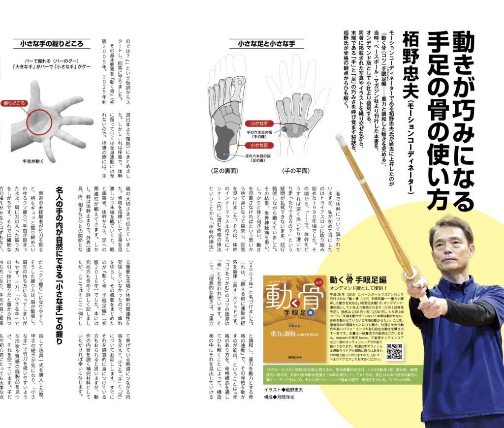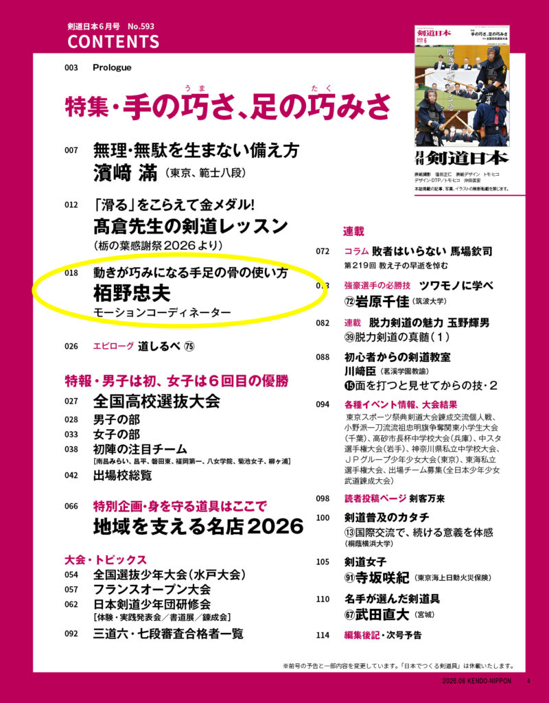 2026年6月号の特集「手の巧(うま)さ、足の巧(たく)みさ」にて、本書の著者である栢野忠夫氏が、そのメソッドを剣道に活かす事例をふんだんに紹介しています。