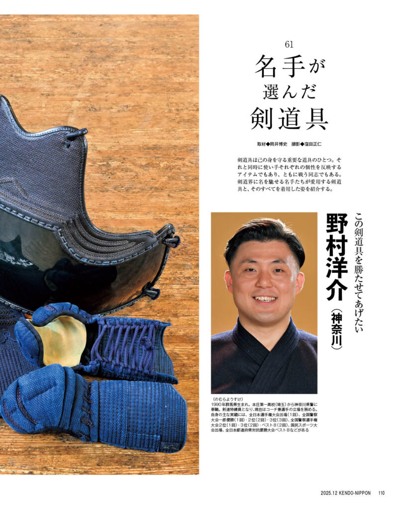チームの大将を務めた野村洋介選手は、警視庁や大阪府警の大将からも勝利をあげる大活躍を見せました。野村選手が愛用している防具について、最新号(12月号.10月24日書店発売)にて詳しく紹介しています。しかもその記事の見出しが「この剣道具を勝たせてあげたい」。「なんとすごいタイミング」と思います。